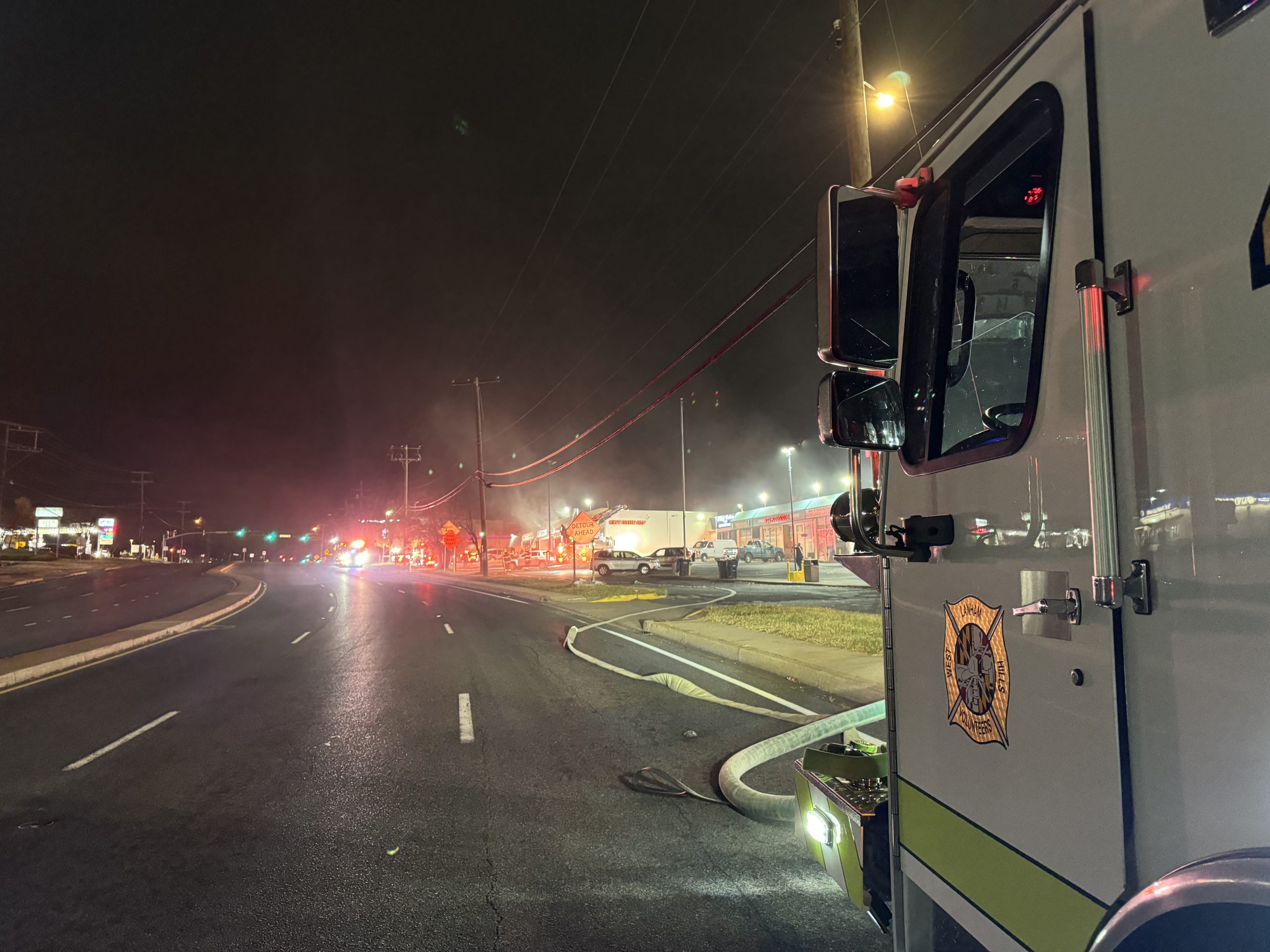 Shortly after clearing a run on RT 50, E828 was alerted to the 7400BLK of Annapolis rd for a report of smoke coming from the building. First arriving units found smoke showing from a 1 story commercial building. The Crew from 28 deployed a back up line and made entry to assist on division 1. Crews operated for roughly an hour before returning to service.